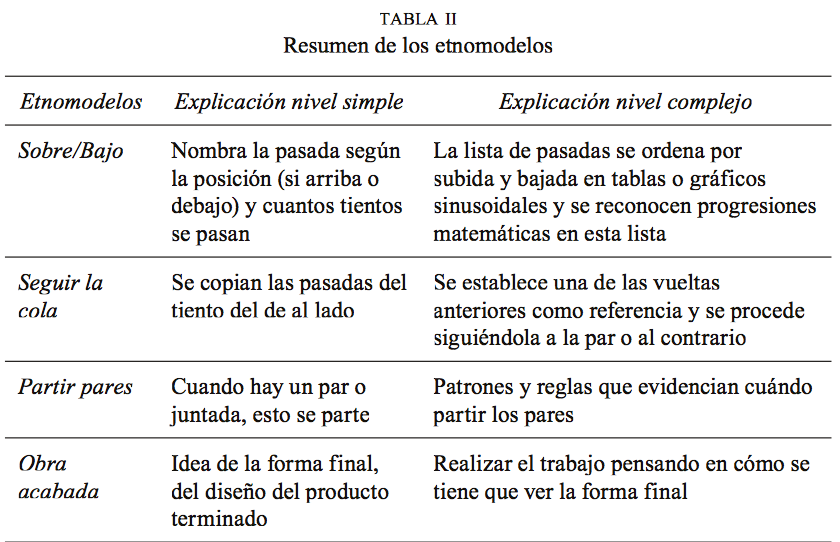 El orden de presentación de los etnomodelos coincide con el orden cronológico en el que se manifestaron durante la práctica artesanal y, a su vez, con la enculturación de la investigadora en el manejo de estos. Además revela una manera de conectarlos.