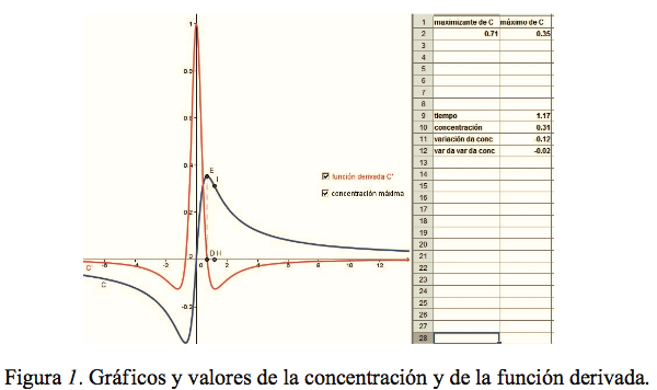 Así, para empezar a estudiar cualitativamente la variación de la concentración del medicamento en el torrente sanguíneo y responder aproximadamente a las cuestiones propuestas, la comunidad de estudio potencial podría empezar utilizando un instrumento informático como el GeoGebra que permite intuitivamente ver que la concentración crece, alcanza un valor máximo y después decrece. Dicho instrumento también permite comparar la gráfica con valores puntuales de la concentración (en la tabla adjunta) y pone de manifiesto cómo se relaciona la variación de dichos valores con la forma de la gráfica.