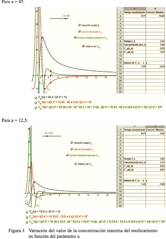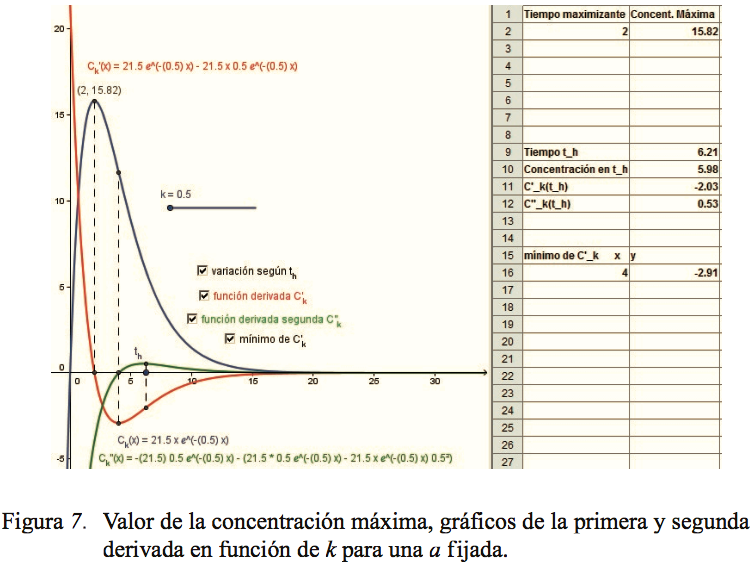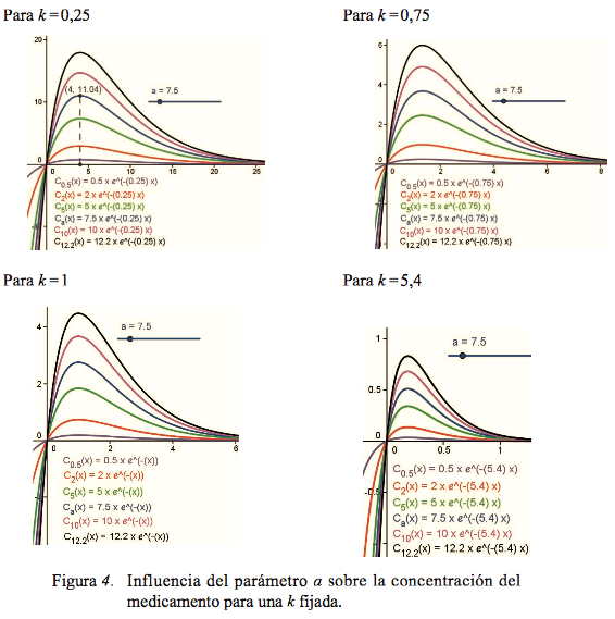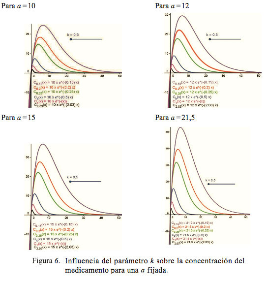 Se observa que, para cada valor de a fijado, cuanto mayor es el valor del parámetro k menor es el valor máximo de la concentración. También es posible la manipulación del valor de k usando el «selector» creado con el GeoGebra para observar la variación resultante de la concentración del medicamento.