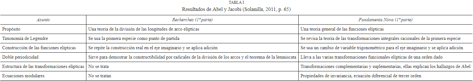 Desde esta perspectiva, las descripciones historiográficas más comunes y predominantes sobre los aportes de Abel (1827, 1828) y Jacobi (1829) a los fundamentos de las funciones elípticas parecen ingenuas y hasta intrascendentes. Nos referimos concretamente a ese lugar común tan recurrente sobre la genialidad abeliana - jacobiana de invertir las integrales elípticas. Desde el punto de vista del profundo cambio vivían las matemáticas, dicha anotación, tan generalmente proferida sobre la materia, casi que se desvanece.