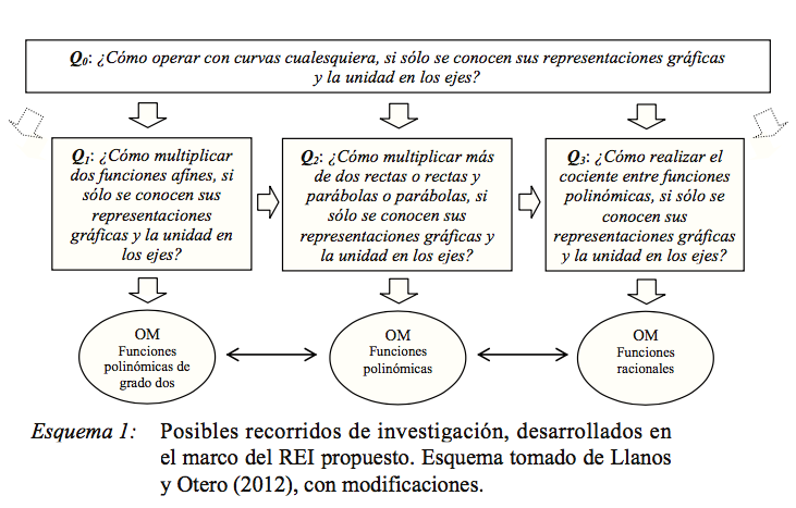 De los recorridos mencionados como emergentes del REI, se ha desarrollado la investigación en tres partes determinadas por el estudio de las preguntas derivadas relativas a la multiplicación de dos rectas, la multiplicación de más de dos rectas, rectas y parábolas o entre parábolas; y también el caso del cociente entre funciones polinómicas (Gazzola, Llanos y Otero, 2013; Llanos y Otero, 2013b; Otero, Llanos y Gazzola, 2012). Las preguntas y las OM del programa “cubiertas” por el REI en su implementación pueden sintetizarse en el Esquema 1, partiendo siempre del “germen” de la investigación que en este caso ha sido la pregunta generatriz Q0.
