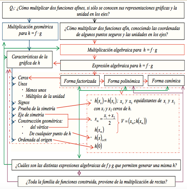El planteo mesogenético que se realizó inicialmente como consecuencia de introducir el REI en el aula permitió justificar por qué se comienza por el recorrido que desencadena la pregunta Q1: ¿Cómo multiplicar dos funciones afín, si sólo se conocen sus representaciones gráficas y la unidad en los ejes? La razón es que ésta es la inicialización más disponible para los estudiantes de 4to Año de la Secundaria, que están muy familiarizados con las rectas (Llanos et Otero, 2013a) y entre las operaciones, la multiplicación permite ingresar en el estudio de la OM de las funciones polinómicas de segundo grado central en el programa de estudio de ese año escolar.