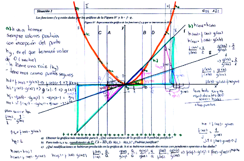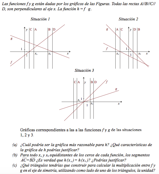Desde la primera situación se introduce el problema de construir una curva para h. Las rectas que se multiplican tienen pendientes con signos opuestos y f y g tienen ceros distintos. En este caso los alumnos responden solamente a los ítems a y b. Por una decisión situada en el nivel de la mesogénesis, el ítem c, no es abordado en la primera situación.