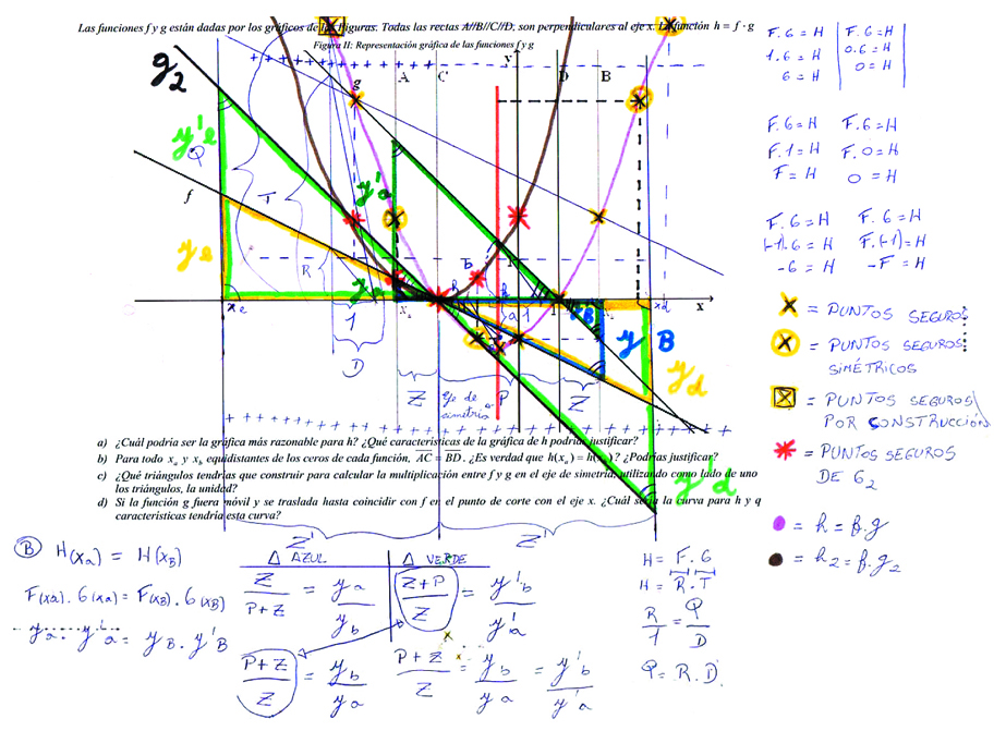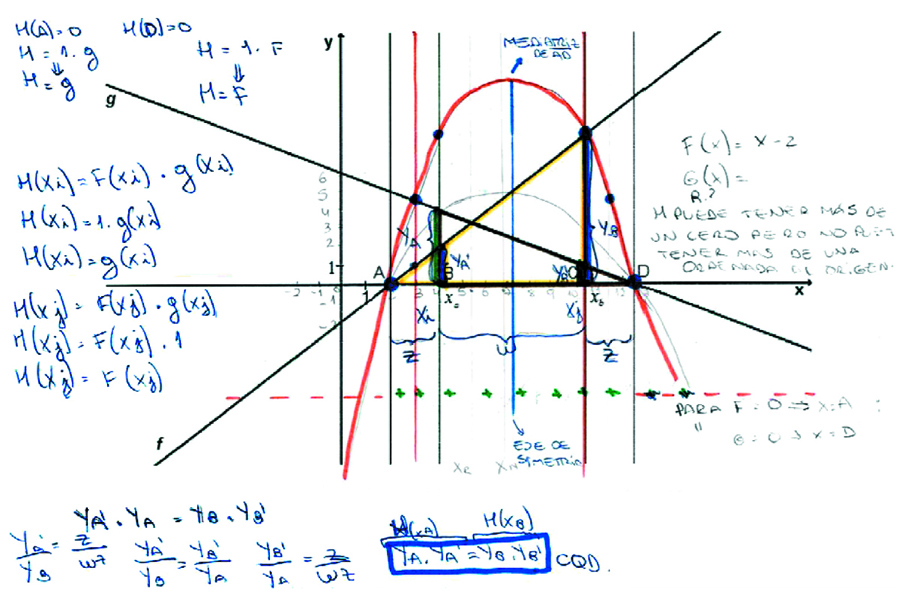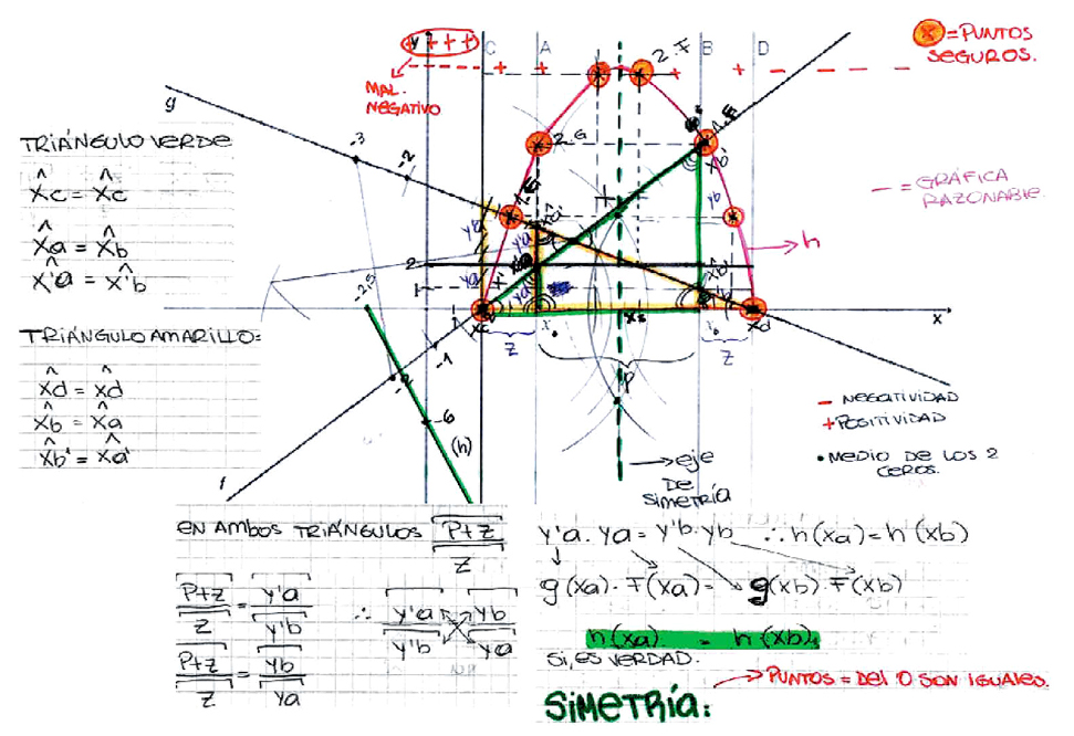 Para responder a las preguntas que se introducen en la situación, los estudiantes comienzan por identificar los puntos notables (que ellos llaman “puntos seguros” pues se construyen a partir de la información que conocen) y analizan también los signos de h a partir del análisis de los signos de las rectas f y g que se multiplican. La construcción de los puntos notables y signos presentó algunas dificultades dado que las respuestas requieren de un tiempo “de maduración”, de avances y retrocesos, de una adecuada distribución de responsabilidades, de discusiones, de acuerdos. Otra cuestión crucial, aunque más compleja, es relativa a la prueba por la simetría de la curva. En todas las implementaciones ha sido posible obtener dicha prueba, pero siempre con la dificultad de los estudiantes para identificar los segmentos que permite construir los triángulos semejantes para probar la simetría de la curva por medio del Teorema de Tales. Una modificación en la mesogénesis y la topogénesis es necesaria, porque de lo contrario los alumnos no pueden avanzar en la construcción de los triángulos que esta prueba requiere.