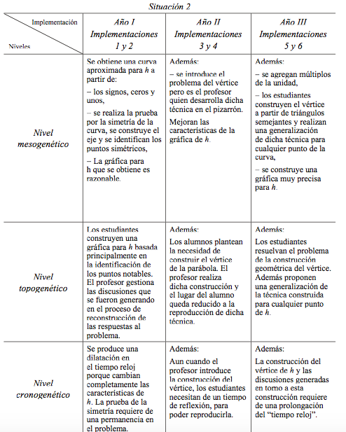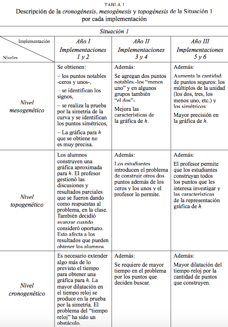 Los alumnos, dispuestos en equipos de trabajo, asumen la responsabilidad de obtener una gráfica para h. Las diferencias entre los distintos años de implementación, se dan principalmente por los problemas que se introducen al medio en cada caso, y las decisiones que el profesor toma para abordarlos. Estas modificaciones en la topogénesis, mesogénesis y cronogénesis entre los distintos años de implementación, se sintetizan en la tabla i. Es importante aclarar que se indica en el análisis las modificaciones que se producen entre un año y otro. Esto permite describir lo que se incrementa en cada nivel respecto del año anterior, es decir, sólo se describen las diferencias. Esta aclaración sirve para todas las Tablas correspondientes al análisis que se colocan en este trabajo.