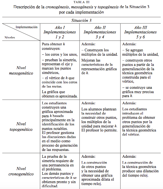 Se introduce en los dos primeros años el problema de la multiplicidad de los ceros; mientras que en el último este aspecto ya ha sido tratado, pero igualmente es propuesto por el profesor para analizar otros casos de parábolas con ceros coincidentes; y más en particular en el origen de coordenadas. Se analizan las características de la gráfica de h con dos ceros reales iguales. En esta situación el vértice de la parábola coincide los ceros de las rectas. En todas las implementaciones los estudiantes continúan identificando los signos y los puntos posibles de construir a partir de la información que proporciona la situación. Las diferencias por cada año de implementación se dan por la cantidad de puntos que se construyen, a partir de los cuales se obtiene una representación más o menos aproximada para h. A partir de los niveles cronogénesis, mesogénesis y topogénesis, se detallan en la tabla iii las diferencias entre los distintos años de implementación para esta situación que introduce el problema de las parábolas con dos ceros reales iguales.