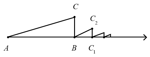 Dibuje un rayo horizontal de origen A. Sobre el rayo ubique un punto B de modo que el segmento AB tenga una longitud de 0,9 unidades. Construya ahora un triángulo ABC, rectángulo en B y de modo que la medida del segmento BC sea el 10% de la medida del segmento AB (ver Figura 1 . Sobre el rayo inicial y a continuación del trazo AB, copie el trazo BC, determinando el punto C1. Forme ahora un nuevo triángulo BC1C2 rectángulo en C1 de modo que la medida del segmento C1C2 sea el 10% del segmento BC1. Itere este proceso, es decir, continúe la construcción de triángulos rectángulos de manera similar y de modo que la medida de uno de sus catetos sea el 10% de la medida del cateto basal anterior. Se pide que determine cuál es la longitud del trazo más pequeño posible que contenga a todos los ACn.