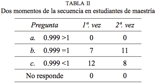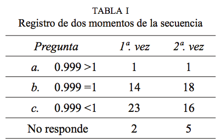 Comparando las columnas de respuesta (tabla I), queda de manifiesto que para muchos participantes la prueba no fue convincente, ya que solo 4 de entre ellos cambiaron su respuesta a la alternativa b., y 3 no respondieron, aumentando de esta forma la incertidumbre13 respecto del valor real que tiene 0,999.... Así también, se puede observar que, para al menos 16 participantes, la prueba fue innecesaria. (La persona que eligió la alternativa a. explicó que 0,999… tenía ‘más números’ que 1).