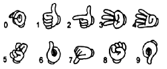 Convém explicitar que em Libras, os algarismos de 1 a 9 são representados com as configurações de mão da Figura 1 A Figura 2 apresenta os sinais que representam as quantidades (cardinal). Podemos observar nas duas Figuras (1 e 2 que os sinais para os algarismos 0, 5, 6, 7, 8 e 9 possuem a mesma configuração de mão e direcionalidade. Já os sinais 1 e 2 são diferentes na sua configuração de mão e direção, os sinais 3 e 4 possuem a mesma configuração de mão, mas direções diferentes; 3 e 4 na horizontal representam os algarismos e 3 e 4 na vertical representam quantidades. Para continuar a sequência numérica, a exemplo do número dez, articula-se o sinal do algarismo 1 depois o zero; para o 11, articula-se o 1 duas vezes; para 13, o 1 e o 3; para o 100, articula-se o 1, depois 0 e 0, e assim por diante.