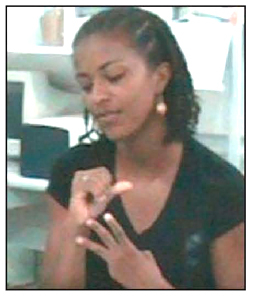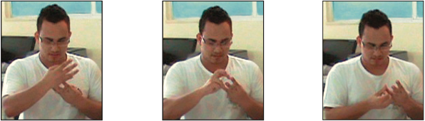 A execução da tarefa foi videografada mediante o consentimento do aluno através da assinatura do termo de consentimento livre e esclarecido do aluno e do termo de uso de imagem, atendendo as normas exigidas pelo Conselho de ética em pesquisa. Tratando de surdos sinalizadores e da natureza da pesquisa, as gravações em vídeo possibilitam visualizar os eventos gravados com a frequência que for necessária, em tempo real, em câmera lenta ou quadro a quadro, permitindo análises mais profícuas. A análise dos dados, provenientes dos filmes e dos registros escritos dos alunos, também contou com a participação da pesquisadora e da intérprete de Libras. Das filmagens, transcrevemos seu conteúdo e revisitamos quantas vezes foram necessárias, utilizamos os recursos do Windows Media Player (parar, adiantar e voltar). As fotos foram capturadas dos filmes em momentos de parada. Para melhor separar os gestos dos sinais utilizamos a tipologia dos gestos de David McNeill (1992), observando o contexto da tarefa, e as configurações dos sinais matemáticos na Libras através do dicionário de Libras (Capovilla, Raphael, & Mauricio, 2012). A identificação dos conhecimentos em ato (conceitos-em-ato e teoremas-em-ato) foi sendo obtida através da observação dos registros (escritos, dos gestos e dos sinais) e pela comparação com os conceitos formais da matemática.