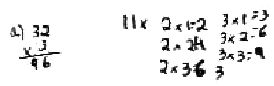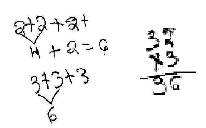 Rodrigo utilizou o esquema de correspondência termo-a-termo (cada sinal em Libras fez corresponder a um dedo da sua mão, denotamos sinal-a-dedo) coordenada com a contagem. O conceito-em-ato evidenciado pelos gestos rítmicos foi à compreensão da multiplicação como uma adição repetida de parcelas iguais, enfatizada pelos professores nas escolas. Os gestos dêiticos (apontar com o olhar) evidenciou também o conceito de bijeção (quando fez corresponder cada sinal em Libras a cada dedo), o conceito de cardinal (o último número contado corresponde ao total) e o conceito de contar a partir de. No registro foi evidenciado o conceito da organização dos algarismos no algoritmo da multiplicação, unidade em baixo de unidade (2, 3 e 6) e dezena em baixo de dezena (3 e 9), conforme Figura 5.