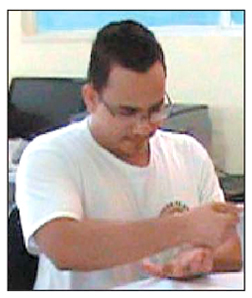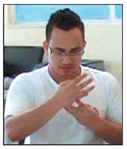 Na multiplicação 32x3, o aluno Henrique (19 anos) disse que não sabia fazer mentalmente, portanto, começou armando a conta no papel e registrando a sequência 2x1 = 2, 2x2 = 4, 2x3 = ..., conforme a Figura 13 Para preencher a lacuna (2x3), configurou, com a mão esquerda, a quantidade 2 e, com a mão direita o sinal 3; apontando (gesto dêitico) a configuração do 3 (mão direita) para cada dedo da mão esquerda, como se pensasse 3+3. Assim registrou no papel 2x3 = 6 (Figura 13). Em seguida, registrou 3x1 = 3, 3x2 = ..., 3x3 = ... (Figura 13). Para preencher as lacunas, configurou o sinal 3 na mão esquerda, e, com a mão direita, apontou (gesto dêitico), biunivocamente, os sinais 4, 5 e 6, respectivamente, para cada dedo da mão esquerda (Figura 14). Assim, preencheu a lacuna, 3x2 = 6. Em seguida, repetiu o procedimento para 3x3: com a configuração do sinal 3 na mão esquerda, apontou (gesto dêitico) para cada dedo da mão esquerda, a sequência de sinais 7, 8, 9, respectivamente. Finalmente, registrou o cálculo, conforme figura 13.