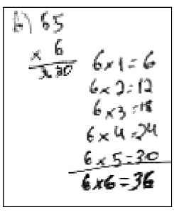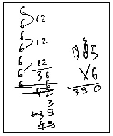 E na multiplicação 65x6, Rodrigo inicialmente armou a conta no papel. E para multiplicar 6x5, ele sinalizou o cinco na mão direita e movendo esta configuração (gesto rítmico) seis vezes, sinalizou olhando (gesto dêitico), simultaneamente, com a mão esquerda, os algarismos 1, 2, 3, 4, 5, 6 (Figura 6). Como se estivesse pensando: 5 uma vez, duas vezes, três vezes até 6 vezes. Em seguida, abriu 6 dedos e uniu-os de dois em dois (gesto metafórico), como se estivesse somando: (5+5) + (5+5) + (5+5), conforme Figura 7 Finalmente, sinalizou 30 e registrou o zero na ordem da unidade e o 3 registrou em cima do 6 (Figura 8). Tentou fazer a mesma coisa com 6x6, sinalizando com a mão esquerda o 6 e com a direita 1, 2, 3 até o 6, mas não conseguiu, então foi para o papel. No papel, registrou o 6 (seis vezes), associou de dois em dois e somou (Figura 8).