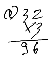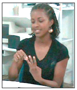 Na multiplicação 32x3, a aluna Lucila (22 anos) levantou três dedos da mão esquerda e com a mão direita apontou (gesto dêitico) com o indicador para um dedo da mão esquerda (Figura 9), sinalizando com a mão direita, 6, 7, 8, 9 até o 10 (Figura 10). Em seguida, sinalizou desculpa e recomeçou o cálculo: levantou novamente três dedos da mão esquerda, movendo levemente essa configuração duas vezes (gesto rítmico). Com a mão direita, sinalizou 6, 7, 8, 9, 10, 11, 12 até o 18. Após, sinalizou 3x32 = 18 para a intérprete. A intérprete perguntou “como?”, então ela apontou (gesto dêitico) para o 3x3 no papel e sinalizou 3+3+3. Em seguida, com a mão esquerda sinalizou 1, 2 e, simultaneamente, com a mão direita desenhou no espaço dois traços (/\) (gesto metafórico), conforme Figura 11 Depois fez o sinal de soma. Como não conseguiu fazer mentalmente, pediu para fazer o cálculo no papel (Figura 12). Enquanto registrava expressava quantidades nos dedos (Gesto icônico).