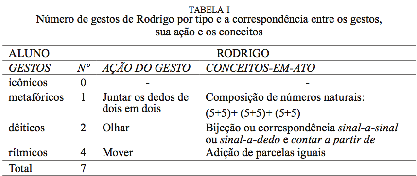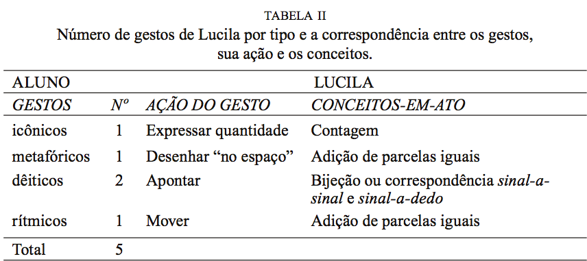 As tabelas I, II e III mostraram que os alunos fizeram no total 37 gestos, sendo 25 de Henrique, 5 de Lucila e 7 de Rodrigo. Os tipos mais utilizados foram os gestos dêiticos (29), seguido dos gestos rítmicos (5), depois os metafóricos (2) e, por último, os icônicos (1). Os gestos metafóricos de Rodrigo e Lucila apresentaram características de iconicidade, conforme McNeill (2005, citado por Seelander, 2012). O de Rodrigo teve algo de físico (Edwards, 2005), quando ele juntou os dedos de dois em dois como se fizesse um laço ou traço, imitando os registros escritos que aprendemos e fazemos na escola do ensino fundamental. Houve predominância de gestos dêiticos, acreditamos que isso se relaciona diretamente com a natureza da atividade de cálculo. Estes gestos apareceram, na maioria das vezes, combinados com os sinais em Libras formando o esquema de correspondência um-para-um (Goldin-Meadow, 2014) próprio do raciocínio aditivo7 e tão comum em contagens desde os primórdios da humanidade, quando se utilizava os dedos da mão para estabelecer uma relação entre cada dedo e cada elemento da coleção a ser contada.