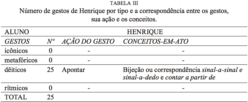 O esquema utilizado por Henrique foi a correspondência sinal-a-sinal e sinal-a-dedo coordenada com a contagem e o esquema de contar a partir de. Nas multiplicações 32x3 e 65x6, observamos que os conceitos-em-ato evidenciados pelos gestos dêiticos foram a multiplicação como a soma de parcelas iguais, bijeção e cardinal. No registro, Henrique evidenciou a organização do algoritmo da multiplicação, unidade em baixo de unidade, dezena em baixo de dezena, porém, no momento de multiplicar 6x5, registrou o resultado 30 no produto, e não somou as 3 dezenas com o resultado 36 = 6x6, para obter 39. Considerou esta multiplicação como uma multiplicação sem reserva. Além disso, o aluno explicitou através do gesto dêitico, o seguinte teorema-em-ato: a sequência dos múltiplos consecutivos de um número é uma progressão aritmética cuja razão é este número, ou seja, nos múltiplos de 2 a razão é 2, nos múltiplos de 3 a razão é 3 e assim sucessivamente. A tabela III resume os tipos de gestos mobilizados por Henrique, especificando sua frequência por tipo e total, bem como a ação do gesto e os conceitos em ato.