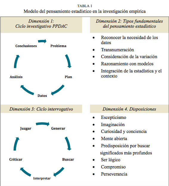 Dirigir el aprendizaje de los profesores hacia el desarrollo del pensamiento estadístico resulta posible porque podemos contar con una caracterización precisa de dicho pensamiento. En efecto, Wild y Pfannkuch (1999) presentan un modelo (ver Tabla I) que se puede tomar como base para diseñar actividades tendientes a propiciar el desarrollo de algunas componentes del pensamiento estadístico en el aula. En otras palabras, el modelo proporciona puntos de referencia sobre los cuales negociar el significado del pensamiento estadístico.