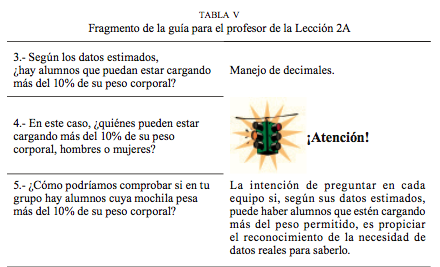 La planificación de la Lección A produjo una secuencia de seis actividades denominadas A, A1, A2, A3, A4 y A5 que fueron elaboradas en hojas de trabajo para los estudiantes. En total fueron 164 alumnos de primer grado de secundaria a los que se les aplicó la Lección A: 36 alumnos del profesor Álvaro, 20 de la profesora María, 26 del profesor Lucio, 40 del profesor Germán y 42 del profesor Juan. Con excepción del grupo del profesor Germán, los demás profesores eran titulares de los grupos que examinaron. El profesor Germán tenía grupos de tercer grado y se decidió que lo aplicara a uno de primero porque ya se había considerado que éstos traen más útiles en sus mochilas y era más probable que varios de ellos cargaran en ella más del peso permitido. El problema de la Lección A consistió en la investigación, por parte de los estudiantes, acerca del peso que cargan en sus mochilas en relación con su peso corporal, para determinar si son los hombres o las mujeres quienes cargan más peso en las mochilas, así como discutir acerca de las consecuencias de cargar en las mochilas un peso que excediera el 15% (posteriromente fue el 10%) del peso corporal del alumno.