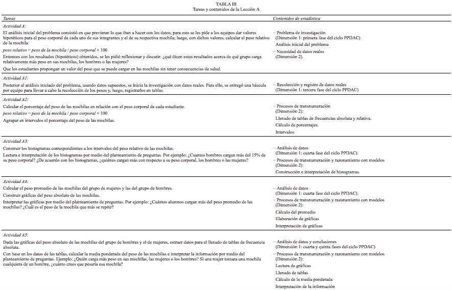 En la siguiente tabla III se describen las tareas planteadas en cada actividad y los contenidos de estadística que éstas implicaban en relación con los elementos del pensamiento estadístico.