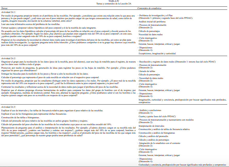 La Lección 2A se conformó de tres secuencias de actividades (2A.1, 2A.2 y 2A.3) que se diseñaron en hojas de trabajo para los estudiantes y de una guía para el profesor. Esta lección se administró a un total de 163 estudiantes de los distintos grados de secundaria a los que les impartían clase los profesores: 25 alumnos de 2º grado de la profesora María, 41 alumnos de 2º grado del profesor Álvaro, 33 alumnos de 3er grado del profesor Germán, 42 alumnos de 1er grado del profesor Juan y 22 alumnos de 3er grado del profesor Lucio. Para esta lección no fue relevante el grado del alumno, pues se consideró que el problema podría presentarse en cualquier grado, aunque ya se sabía que era más seguro que existiera en alumnos de primer grado. En la siguiente tabla (IV) se describe brevemente las tareas que conformaron las tres actividades de la lección con sus respectivos contenidos de estadística y los elementos del pensamiento estadístico implicados. A diferencia de la Lección A, en esta segunda Lección 2A, los profesores fueron más conscientes de los elementos del pensamiento estadístico que se estaban favoreciendo en cada una de las tareas de las actividades.
