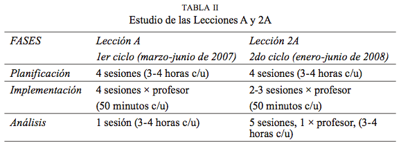 El Estudio de Lecciones en Grupo (por sus siglas en inglés: LSG) es un proceso en el cual los profesores planifican conjuntamente, observan, analizan y refinan lecciones de clase1 (Lewis, 2000). Este proceso ha sido recientemente implementado en investigaciones sobre la preparación de profesores en estadística, pues se reconoce que éste ofrece una alternativa para conectar el salón de clases con el programa de desarrollo profesional (Garfield & Ben-Zvi, 2008). La metodología del Estudio de Lecciones que siguieron los cinco profesores en estudio consistió en dos ciclos, cada uno de tres fases: 1) Planificación: el diseño, por el grupo de profesores, de una lección (o de su reestructuración, en el caso del segundo ciclo), 2) Enseñanza: la implementación de la lección en el aula de cada profesor, llevando registro de lo ocurrido y 3) Análisis: revisión y discusión de los registros y recuerdos de lo ocurrido en clase con el objetivo de mejorar la lección y derivar recomendaciones para su reestructuración y nueva implementación; con esta tercera fase se inicia la repetición del ciclo. Bajo este esquema se tienen las siguientes características específicas.
