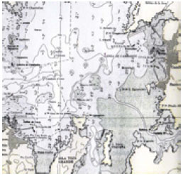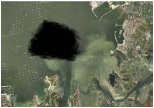 El buque Prestige se hundió cerca de la costa de Galicia en noviembre del año 2002, provocando una marea negra de grandes proporciones y una reacción social que aún es recordada en España. La cercanía en el tiempo del vertido del Prestige representaba para los alumnos una realidad próxima, tanto temporalmente como socialmente. Partiendo de esta situación, en la tercera fase se les entregó a los alumnos una fotocopia a color DIN A3 de una carta náutica de una zona de la ría de Vilagarcía (zona en la que se sitúa el Instituto en el que los alumnos cursaban sus estudios) (Figura 2) y otra fotocopia de una hipotética fotografía vía satélite de un vertido contaminante (Figura 3) junto con las siguientes preguntas, que los alumnos debían contestar por escrito e individualmente: