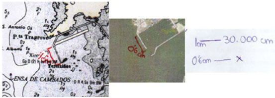 Los alumnos tenían que determinar la escala de una imagen (Figura 3) a partir de otra imagen de la zona pero de escala conocida (Figura 2). Las imágenes del vertido eran diferentes el curso 2010-2011 (escala 1:43300) y el curso 2011- 2012 (escala1:58600). La razón de proporcionar imágenes diferentes los dos años era que la diferencia de escala entre la carta náutica (escala 1:30000) y la fotografía fuese mayor para que los alumnos se viesen en la necesidad de calcular la escala. Una diferencia de escala pequeña puede llevar a considerar un cálculo aproximado del área mediante la escala conocida.