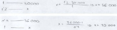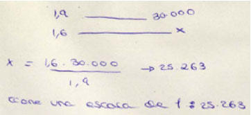 El 45% de los alumnos utilizan un método adecuado para calcular la escala: 2 la determinan usando una única regla de tres (Figura 11) y 7 usan dos reglas de tres (Figura 12).