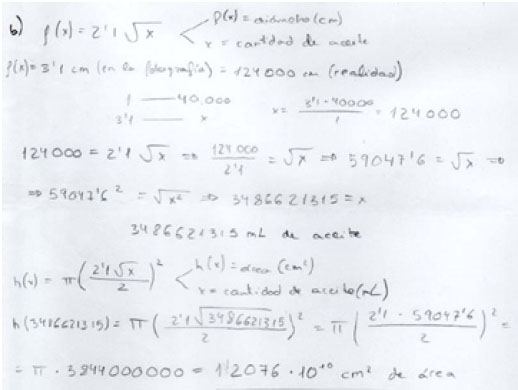 Por su parte, el alumno B2, usa la escala para determinar el diámetro real (ha usado un círculo como medio de aproximar el área de vertido) y utiliza la función f para calcular el volumen.