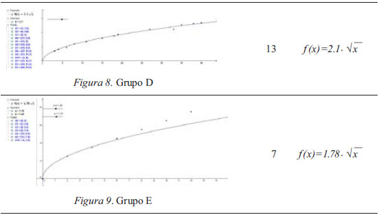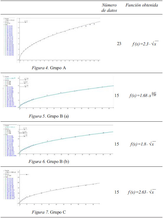 Al concluir la obtención de la tabla de valores o datos, los alumnos se trasladaron al aula de informática del Centro para volcar los datos en el ordenador y obtener la función de ajuste. Cada grupo usó un ordenador y, antes de que introdujesen los datos, se les recordó que disponían de dos archivos GeoGebra que contenían un conjunto de 20 puntos y 60 puntos del plano, todos ellos de la forma ( x , x ) como una forma de ahorrar tiempo al introducir los datos. También se les recordó cómo cambiar con rapidez los valores de las abscisas y ordenadas de los puntos ( x , x ) de los archivos. También se les explicó que podían usar la copia del documento, que mencionamos previamente y que contiene las gráficas de las familias de las funciones elementales. Se les indicó que el fin de esta fase era obtener la función de ajuste de los datos. La duración de todo el proceso no excedió los 15 minutos en ningún grupo. La mayor parte del tiempo la dedicaron al volcado de datos y ajuste de amplitud visible de los ejes. Se observa que utilizan las hojas que contienen las gráficas de las funciones elementales para decidir qué función es la apropiada e identifican inmediatamente que se trata de la raíz cuadrada. Esa situación es común a todos los grupos excepto el grupo B, que intenta ajustar en primer lugar los datos con una función del tipo