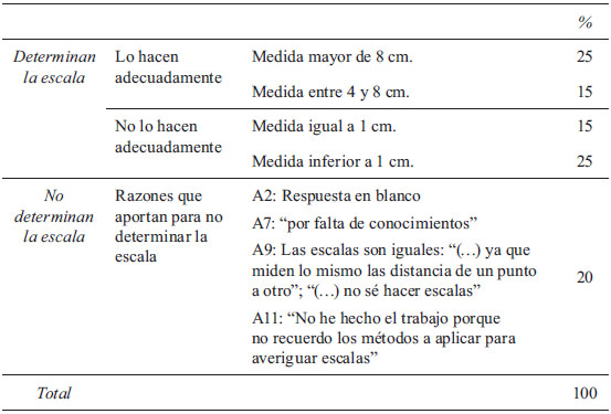 En cuanto al conocimiento de los alumnos sobre el uso de escalas, se realiza una introducción en edad temprana (6º de Ed. Primaria, Real Decreto 1513/2006, p. 4301) y los cálculos con escalas y determinaciones de escalas aparecen de forma recurrente a lo largo de toda la Educación Secundaria, tanto en la asignatura de matemáticas como en otras asignaturas. Se trata, por tanto, de una pregunta en la que los alumnos deben usar conocimientos relacionados habitualmente con la geometría y sobradamente conocidos por los alumnos. En la Tabla II asumiremos que la determinación adecuada de la escala conlleva medir una longitud mayor de 4cm en la carta náutica para determinar la escala de la fotografía.