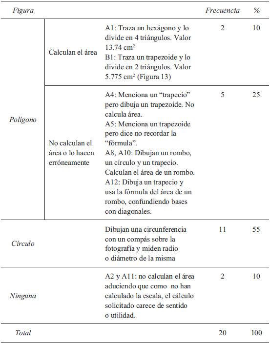 El cálculo debería ser planteado, de forma general por los alumnos, como el cálculo del área de una figura irregular de la que no se dispone de una fórmula que proporcione su área y, por tanto, debe ser calculado trazando diagonales de la figura, generando triángulos y calculando el área de estos, contenidos conocidos desde la Ed. Primaria. En la siguiente tabla (Tabla III) se muestra el tipo de procedimiento que los alumnos han utilizado para aproximar el área de la superficie contaminada y también se detalla el tipo de figura que han utilizado.