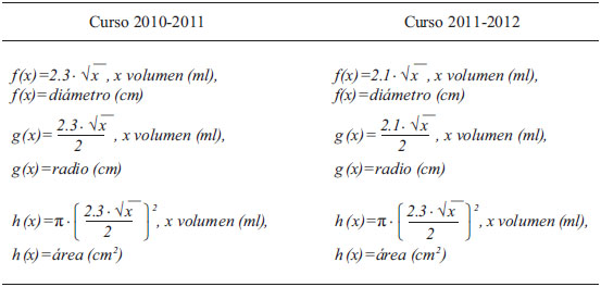 El hecho de que los alumnos no identifiquen la función h (que relaciona área con volumen) como la más apropiada para responder la cuestión planteada puede deberse a varias razones, no todas ellas relacionadas con la dificultad asociada a la pregunta. Pensamos que el haber escrito las tres funciones f , g y h en el encerado ha provocado desconcierto en los alumnos. Indicar qué función deben usar los alumnos limita el uso del modelo en contexto pues proporciona respuestas clave a preguntas que se generan en el uso del modelo en dicho contexto.