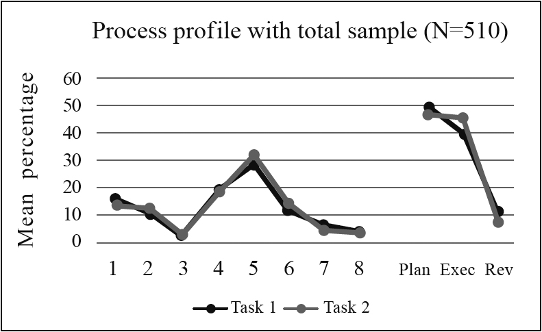 In order to demonstrate if a student's problem-solving process responds to SRL phases, Figure 1 shows the profile of the process followed by students in Tasks 1 and 2. This profile indicates similar processes for both tasks, characterized by a higher frequency of selected categories in planning and execution phases. The means (Table II) indicated a percentage of 49.46% in Task 1 and 45.53% in Task 2 of the students' reports referring to planning categories, while those related to execution were 40.43% and 45.95%, respectively. With respect to the revision phase, mean percentages of categories reported within this phase were 10.15% in Task 1 and 7.57% in Task 2 across categories. It must be noted in this case the high means found in the planning phase (even above those found in the execution phase). This is because the planning phase consists of four sub-processes or categories, while the other phases comprise two.