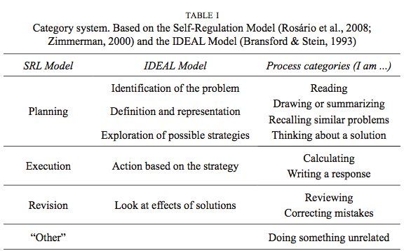 These findings add evidence to the utility of process measures, specifically those based on directed and concurrent self - reporting, in the assessment of cognitive activities (in this case mathematical problem - solving tasks). The usefulness of the assessment tools presented in this studylies, however, in the systems of categories designed, which makes it possible to divide mathematical problem - solving tasks into sub-processes or isolated activities, and provides in-depth insights about a student's strengths or weaknesses, thereby helping to understand their success or failure from the point of view of SRL. This is not only important for instruction, but specially for student learning. In this sense, as Ifenthaler (2012) pointed out, the key link between knowledge about (and the regulation of) one's own problem - solving activities may lie in reflective thinking. Making students aware of their own learning processes may help them generate information about the efficiency of their problem-solving strategies and successfully implement that knowledge in the ongoing problem-solving process, thereby being able to control and regulate their cognition, effort and behavior.