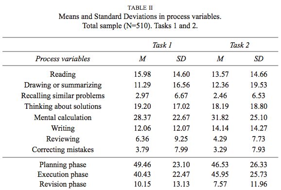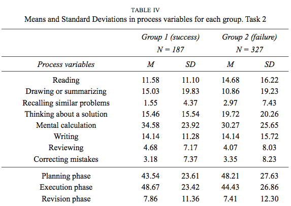 Finally, standard deviations in Table II showed a high variability among the processes shown by students in both tasks, mainly in the categories less reported (“recalling similar problems”, “reviewing” and “correcting mistakes”).
