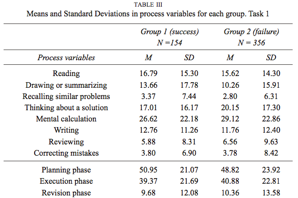 Tables III and IV present the mean scores and standard deviations in process variables for groups with different achievement (Group 1 = success; Group 2 = failure) in Tasks 1 and 2, respectively. Group - compositions revealed the presence of a high proportion of students solving the mathematical problems unsuccessfully. Specifically, 356 students (69.80%) failed to solve the first task while 327 students (60.11%) gave an incorrect answer on the second task. As one of the aims of this study was to know whether there were differences between tasks with varying difficulty, separate analyses for each task were conducted.
