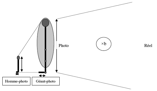 Comme les précédentes, la stratégie 3 suppose l’existence d’une dilatation de l’homme au géant. Contrairement à la stratégie 2 qui se fonde sur le calcul du rapport externe (coefficient de dilatation), celle-ci s’appuie sur la conservation du rapport interne de deux segments du corps, le plus souvent le rapport stature / longueur semelle, ces longueurs étant mesurées sur la photo. On en déduit par quatrième proportionnelle une approximation de la stature du géant - photo. En estimant4 le rapport de la dilatation b qui fait passer de la photo au réel, on peut alors calculer une approximation de la stature du géant réel.