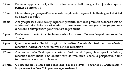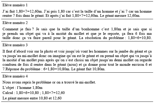 Lors des séances ultérieures du 6 et 9 juin (Tableau I en annexe), lors des débats qu’il a menés, le maître s’est essentiellement appuyé sur ces deux textes. Il a notamment a mis l’accent sur les idées d’étalonnage du géant passant par l’étalonnage du corps d’un élève, et donc sur une expérimentation directe. On pouvait alors espérer que nombre d’élèves s’empareraient des éléments de la stratégie 1 ainsi mis en évidence, les ordonneraient et les coordonneraient pour produire des textes de résolution acceptables.