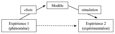 Comme le laisse entendre la référence à un algorithme, le mot « simulation » est ici à prendre dans le sens de « simulation informatique ». Ceci témoigne du souci des concepteurs des programmes de prendre en compte l’évolution technologique, mais restreint le sens initial du terme, qui est la substitution d’une chose (succédané) à une autre, afin qu’elle en tienne lieu lors de l’accomplissement d’une action donnée3. Dans le cas qui nous occupe ici, on peut néanmoins préciser davantage, comme le fait ce manuel de lycée : « Simuler une expérience aléatoire, c’est remplacer cette expérience par une autre, plus économe, plus rapide, et qui permet d’obtenir des résultats analogues. » (Belin, 2000). La difficulté consiste alors à pouvoir assurer que les résultats obtenus seront « analogues ». Un autre manuel précise : « Pour simuler une expérience, on décrit l’expérience aléatoire et on la modélise : on choisit un modèle de tirage aléatoire de nombres qui doit avoir les mêmes propriétés que le phénomène simulé. » (Borreani, 2004). C’est donc l’existence d’un modèle probabiliste commun à l’expérience aléatoire et à son succédané qui va garantir cette analogie, selon le modèle triadique de la figure 1 :