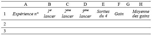 dans le modèle entré dans le tableur, on a trois dés à quatre sommets numérotés 1, 2, 3, 4 et, pour chacun : p(1)=p(2)=p(3)=p(4)=1⁄4. Pour chaque lancer des trois dés on note le nombre total de 4 obtenus, de façon à lui attribuer un gain.