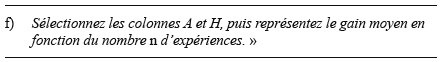 La jonction ne s’opère que dans la dernière question (Quel lien faites-vous entre le résultat de la simulation et l’espérance mathématique de G ?). Mais, ici, le recours à la simulation était-il utile – sinon nécessaire – pour conjecturer le résultat ? C’est d’autant moins évident que le but de la résolution n’est pas de démontrer que l’espérance de G est nulle, mais de calculer cette espérance (et de constater qu’elle est nulle). L’idée des auteurs était peut-être en fait d’ordre « méta » : montrer aux élèves que le recours au tableur peut être utile pour conjecturer la réponse à un problème de probabilités ou, comme ici, pour contrôler la pertinence d’un modèle probabiliste7.