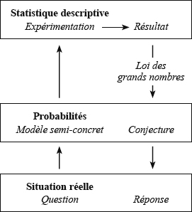 L’analogie des formules donnant, d’une part la moyenne d’une distribution statistique, et d’autre part l’espérance d’une variable aléatoire, semble, on l’a vu, un bon moyen de passer de l’une à l’autre, mais à condition de ne pas les confondre et de savoir à tout moment dans quel cadre on se situe. Les probabilités s’intéressent en effet à un modèle théorique, tandis que la statistique descriptive étudie une série de données issue d’un phénomène observé. Et, dans le cas d’une simulation sur tableur, ce phénomène consiste en la réalisation de l’itération d’un modèle probabiliste. Par exemple, dans le cas de l’exercice étudié, la moyenne des gains observée sur les 2500 épreuves peut être par exemple de 0,0544, tandis que l’espérance mathématique de gain de la variable est exactement 0.