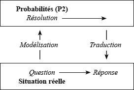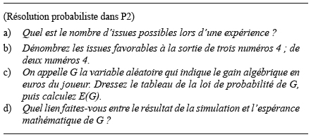 Commentaire. Cette hypothèse permet d’attribuer une probabilité à chacune des issues envisagées ; elle introduit en fait un modèle probabiliste de la situation. Ce passage par P1 est nécessaire, car c’est un modèle que l’on simule : « la simulation a pour préalable de choisir un modèle » (Portail national des professionnels de l’éducation, 2009, p. 7). L’explicitation du modèle est destinée à assurer que c’est bien la même expérience que l’on répète, puisque c’est toujours le même protocole qui sera mis en oeuvre (Parzysz, 2005). Mais dans la pratique le modèle est souvent escamoté : on fait comme si on passait directement de la situation réelle à la simulation. Ce « tour de passepasse » est facilité par le fait qu’on ne considère que des épreuves aléatoires (lancer d’une pièce, d’un dé, tirage d’une boule dans une urne…) pour lesquelles il existe un modèle canonique, qui est alors considéré comme « transparent ». Mais le risque est alors que l’élève cherche par la suite à simuler directement la situation réelle, sans se rendre compte qu’il lui faut pour cela faire des hypothèses, c’est-à-dire élaborer un modèle, aussi peu élaboré soit-il.