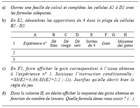 Une différence saute aux yeux par rapport à la géométrie : la guidance de l’élève est très forte, et il reste cantonné au rôle d’exécutant. Cette hypertrophie des instructions a pour fonction principale d’éviter à l’élève non familier du tableur d’être bloqué (en effet, s’il travaille seul chez lui, qui viendra l’aider ?). Les intitulés des colonnes sont donnés, et la première tâche de l’élève consiste à introduire la fonction « aléa » dans les cellules B2, C2, D2 ; il a ensuite à totaliser le nombre de 4 obtenus dans ces trois cellules (fonction « somme »). Il doit ensuite – plus délicat − utiliser une instruction conditionnelle pour faire calculer le gain correspondant ; le manuel vient alors à son aide en lui fournissant la formule à entrer. Enfin, il faut faire calculer la moyenne des gains, ce que l’élève sait – en principe – faire depuis le collège. Mais « faciliter la prise en main des logiciels ne confère pas les compétences requises pour mener à bien des tâches complexes. La transparence que les interfaces sont censées fournir dépend de la proximité de ce qu’elles proposent avec les représentations initiales du sujet. » (Rabardel, 1995). La demande de justification de la question c) a précisément pour objet de tester que l’élève a compris le sens de l’instruction donnée à la machine, mais elle risque d’être purement rhétorique, dans la mesure où l’élève est livré à lui-même. Cette question des compétences relatives à l’outil technologique est explicitement prise en compte dans un certain nombre de manuels, qui présentent des fiches spécifiques sur la prise en main des calculatrices (algorithmique), tableurs et logiciels de géométrie dynamique.