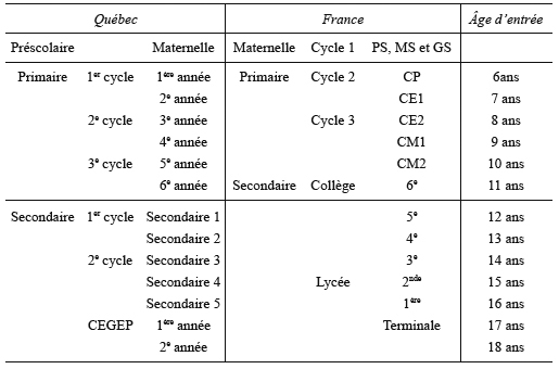 Correspondance entre les parcours scolaires québécois et français (enseignement général)