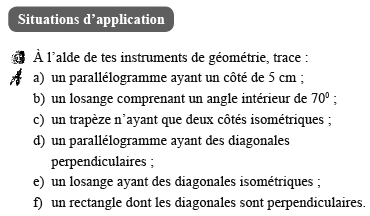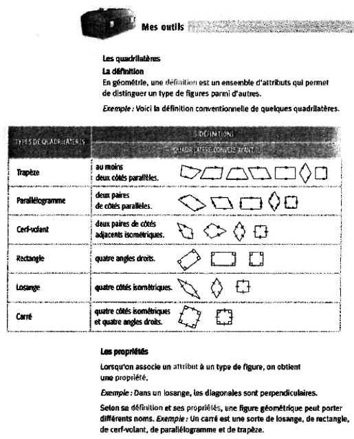 Pour cela, on reprendra en exemple le chapitre sur les quadrilatères, tel que proposé par le manuel Perspective Secondaire 1 (Guay, S. et al., 2005a), rédigé par la même équipe qui a produit Clicmath et que nous avons étudié au paragraphe précédent. On peut constater que la trace écrite de la leçon (figure 4) se limite aux définitions des quadrilatères et qu’elles sont toutes proposées à partir des côtés et des angles droits (donc reprises du primaire); les propriétés des diagonales sont évoquées en bas de paragraphe.
