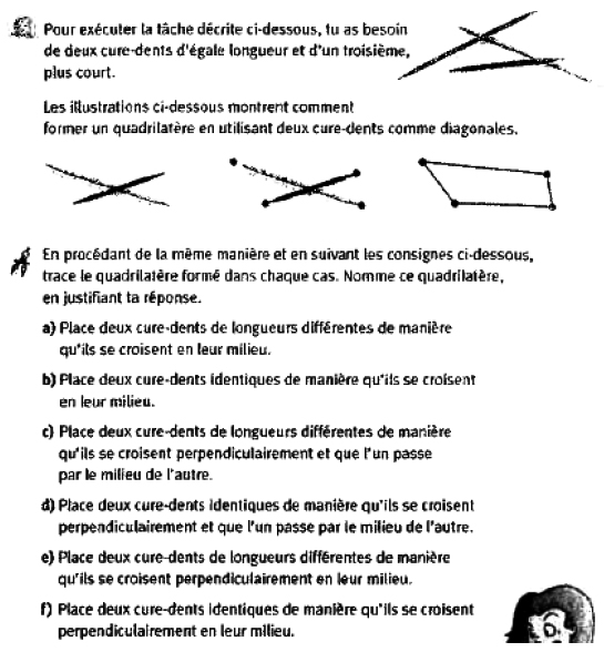 Nous avons demandé aux étudiants de faire l’activité proposée en introduction à l’identification des quadrilatères dans le manuel Presto 5e année (Lacasse, 2003) (figure 9) :