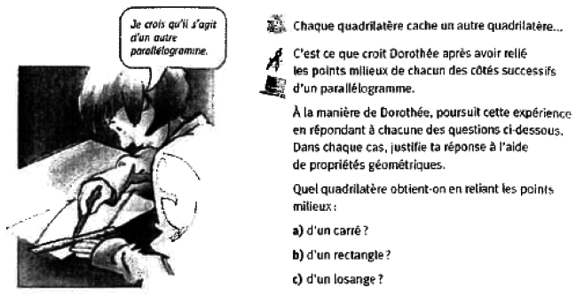 En effet, la tradition québécoise veut qu’en géométrie, la figure soit faite en vraie grandeur, à partir de mesures données et à l’aide des instruments; le soin dans le tracé est déterminant. L’élève a toujours la possibilité de prendre des mesures pour établir une conjecture, sa conviction, voire sa validation. Mais dans cet exercice aucune mesure n’est donnée, le soin et la précision ne seront que des aides pour conjecturer. Les élèves ne connaissent pas le « théorème des milieux » dans le triangle et sont donc dans l’impossibilité de donner une justification qui relève de GII. La « meilleure » réponse qu’ils puissent donner est le constat de la position des diagonales du nouveau quadrilatère et la nature du quadrilatère qui y est associée. C’est d’ailleurs ce qui est proposé en corrigé dans le manuel de l’enseignant où les positions des diagonales sont décrites comme étant « verticales » et « horizontales » (voir Annexe 4). Cet exercice pourrait relever d’une activité en GII mais les élèves n’ont pas les moyens de l’aborder comme tel et ils restent dans une, validation instrumentée donc en GI. On peut aussi considérer que cette situation est révélatrice de la difficulté à gérer le passage GI-GII.