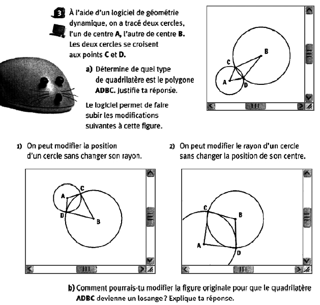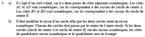 Cette activité, présentée dans un contexte d’utilisation d’un logiciel de géométrie dynamique, se termine par la question posée en b) qui est proche de celle qui a été posée dans le manuel de 5e année primaire. La différence est que, ici, le losange n’est pas dessiné mais des images illustrant les variations des rayons et des centres sont autant de guides pour l’élève. On peut penser que l’élève donne la même réponse qu’en 5e année primaire, et continue de travailler dans le même paradigme. Le guide de l’enseignant donne une réponse plus laconique que dans le manuel de primaire comme si une telle réponse allait de soi pour les élèves (voir Annexe 5).
